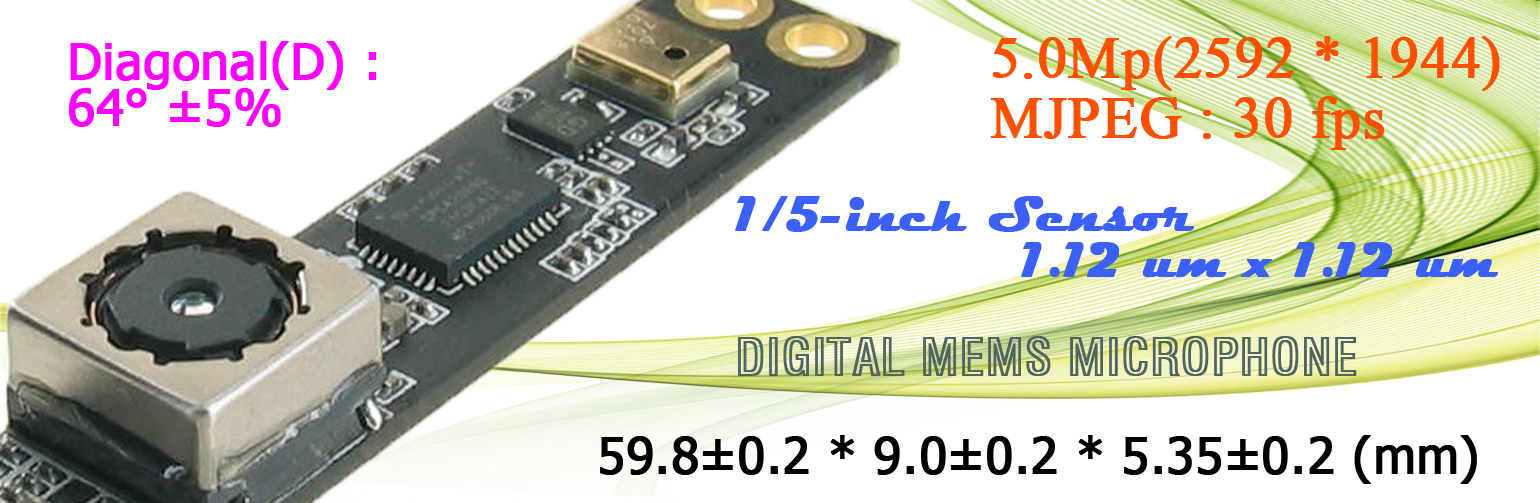The W5AA6-42L6 5Mp USB Camera Module is a high-performance imaging solution featuring a 1/5-inch, 5.0 Megapixel CMOS sensor that captures detailed images up to 2592×1944 resolution. It offers exceptional versatility with USB 2.0 High-Speed connectivity, full UVC 1.1 and UAC 1.0 compliance, and automatic focus (10cm∼Infinity). The module supports both YUY2 and high-speed MJPEG output, delivering a smooth 30 fps at resolutions up to Full HD (1920×1080) and beyond. Equipped with a digital MEMS microphone and comprehensive image pre-processing features (including Auto White Balance, Exposure, and Backlight Compensation), this compact module (59.8×9.0×5.35 mm) is ready for a wide range of applications.